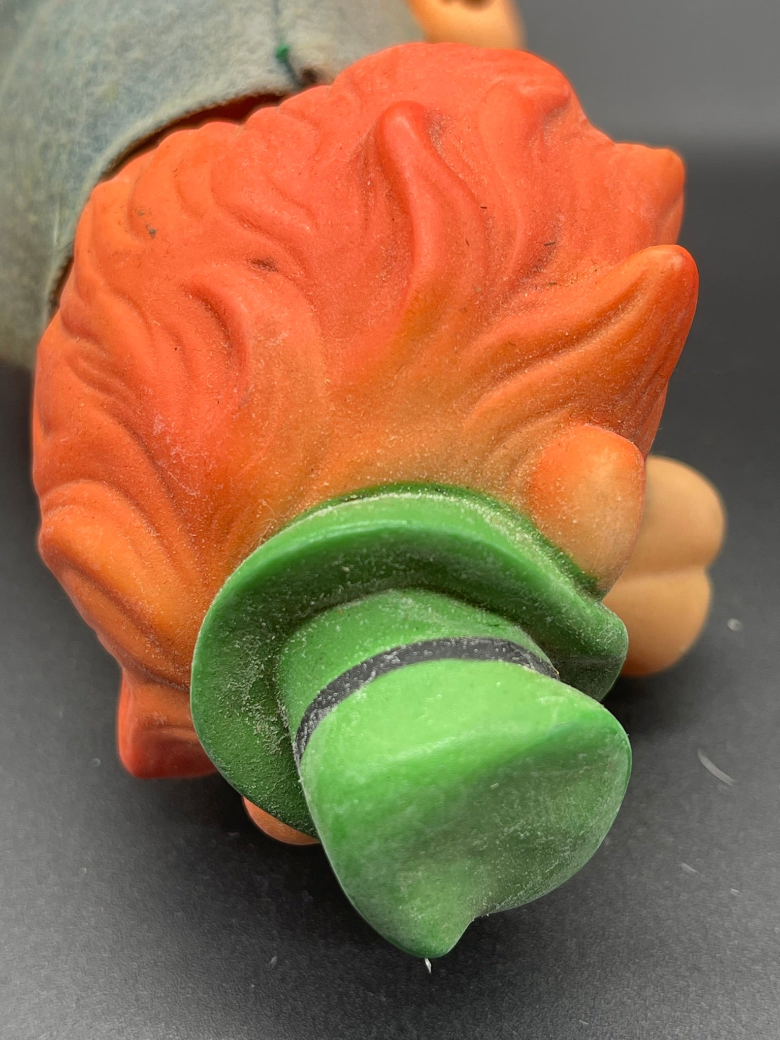- The molded plastic head retains its bright colors and is in good condition, with minor scuffing typical for a toy of this age.